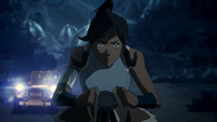 Korra, joined by Asami, ventured to the town in the Future Industries airship, trying to ease her friend's worries about them going alone by saying that Royal Earthbender Guards awaited on guard and that the queen just enjoyed bossing her around. After arriving at the town, the Avatar did not like the looks of things, but informed the guards on duty to load the tax money onto the ship. At that moment, the girls saw a flare, followed by Gombo and his gang of barbarians riding in to surround them, causing Korra to rethink her decision to go without everyone else. Nonetheless, she and Asami took up their challenge. After tripping up the gang leader, she earthbent at them, launching their motorcycles into the air and also protecting Asami from a potential attack. The Avatar also airbent at another motorbike, defeating the two men riding it. After Asami defeated the last two gangsters, Korra knocked down Gombo with a slab of rock, causing the gang to retreat. As they left though, Gombo shouted at the Water Tribe girl that she was on the wrong side, and the money belonged to the people, leaving her feeling that he may indeed be right.