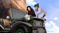 On the oasis' outskirts, Naga led them to a rock, which Korra earthbent to reveal Aiwei's jeep. The Avatar also realized she forgot to bring treats for her pet, which resulted in her getting slapped in the face with Naga's tail. When Mako proposed going back in to find Aiwei, Korra expressed her desire to go with Mako and Bolin, but was told to stay with Asami in case he came back, while also wanting to avoid attracting too much attention to themselves. As she watched over the oasis, she expressed her frustration about not knowing Zaheer's intent, but soon joined Asami when she found a note in Aiwei's vehicle, informing him to be at a place named "Xai Bau's Grove" at sundown, which the Avatar deduced as where the emissary and Zaheer would meet. The two, however, were not able to find the location on the map. Mako and Bolin soon returned to inform them they found Aiwei at an inn, Korra proposed busting into his room and demanding answers, but Mako rebutted by saying it would cost them their element of surprise, instead suggesting a stakeout. Korra agreed, saying that Aiwei could lead them right to Zaheer.