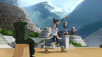 Sometime later, Korra tested her skills against Wing. She dodged two meteorite fragments and attempted to attack him with cables, but was taken down when her opponent stomped on them and bent them back at her, entangling Korra and knocking her down. She got back up, however, and managed to defeat Wing by tripping him up with the wire and declared herself metalbending champion in celebration.