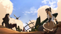 The two made their way to the cockpit, where Korra airbent the co-pilot into the control panel, damaging the ship's controls and causing it to descend rapidly. When the co-pilot came after her, the Avatar again airbent him back, sending him into the captain and breaking the radio system. When Asami made note of this, Korra said it was not her fault that the airship was a "hunk of junk" before being told to hang on to something as they crashed into a sand dune.