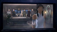 Korra later joined her friends, Suyin, and her family for Opal's farewell dinner. During the meal, Varrick showed her and Asami his airbender finder, to which she asked if it really worked, but Varrick told them that it must be blown in. She subsequently joined in raising her glass in a toast to Opal and watched the airbender leave for the Northern Air Temple. The Avatar also laid a hand on an upset Bolin's shoulder as they made their way to their rooms for the night.