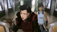 In the radio room, seeing Bolin starting banter with Meelo over baby sky bison, Korra shoved her friend out of the way and demanded Meelo retrieve Tenzin. Once Tenzin responded, Korra warned him about Zaheer approaching the Northern Air Temple and to evacuate, only to be told it was too late as, at that moment, Zaheer and the Red Lotus arrived.[12]