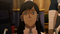 Korra watched as the ceremony took place; she was praised by Tenzin for reviving the Air Nation and her willingness to risk her life for it. She was also vowed to that the Air Nation would follow in her footsteps and help provide balance to the world, slightly bowing her head with a smile upon her airbending master bowing to her. The Avatar's eyes watered as the ceremony reached its conclusion and she shed a single tear.[15]