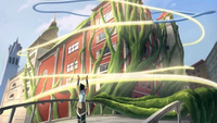 Korra and Asami soon went out for a drive, which the young Avatar struggled to do. The two had a discussion about Mako and what happened while they were involved with him. Korra was glad he did not come between them and was glad to have a girlfriend to hang out with. She soon drove up to a vine and quickly stopped before being confronted by an angry spirit. She soon got an idea to rid the city of the vines after the spirit told her they were one and the same. However, Raiko and the press soon approached, and Korra demanded they ask no questions. She subsequently entered the Avatar State and began using spiritbending, which appeared to have initial success as the vines receded into the water. Just as the press began asking her questions, however, the plants quickly regenerated and became even more numerous. Korra quickly evacuated a nearby building, flying up on her glider to save a boy who was trapped in an upper level. As its top spire began to collapse, she saved the boy by rapidly gliding him down, and spared the citizens of further injury by catching the spire with earthbending and easing it to the ground.