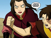 Zuko called on his friends to accompany them as well, though when they came to the palace and noticed Azula there, he had to explain to them how things had gone down and how she was going to accompany them to Hira'a eventually winning his reluctant friends over for the idea.[12]