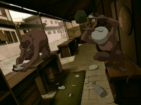 A group of hog monkeys were among the species that lived at the Ba Sing Se Zoo, though their cage was unclean and dark and the animals themselves were unhappy. Aang came across the zoo during his stay in Ba Sing Se, and seeing the poor conditions, endeavored to release the animals from their cages and move them to a more expansive zoo in the Agrarian Zone. However, after being released, the hog monkeys began harassing the citizens of the city and destroying a number of shops. Upon hearing the signal from Aang's bison whistle, the hog monkeys ceased their destruction and rushed with the other animals to follow the sound, eventually finding themselves in the much larger zoo Aang had created outside the Inner Wall.[4]