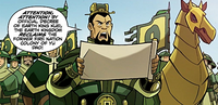 How lived in Ba Sing Se's Upper Ring[4] and was a veteran of the Hundred Year War.[3] He had risen to overall commander of the Earth Kingdom Army and head of the Council of Five by 95 AG.[4] Upon becoming one of the state's top commanders, he was informed of numerous details of the Conspiracy of Ba Sing Se, including the Dai Li's use of brainwashing to keep the capital's population in line.[5]