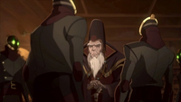 On a following night, Hundun dealt with Viper and some Triple Threats in an alley in Republic City, when Korra passed by and chased the mobsters away, believing them to be threatening the old man. Upon being asked if he was all right, Hundun simply laughed and disappeared into the shadows, whereupon his followers stunned the confused Avatar with poisoned darts and brought her to him in an apartment. Hundun instructed his followers to immediately begin the chi-extraction process, though upon noticing that the Avatar awakened, he hastily ordered the chi-blockers to stop her before disappearing. Knowing that her chi was blocked, his voice mocked Korra when she attempted to bend, confidently telling her that she would not be able to escape. When she fled from the apartment down an alley, a laughing Hundun appeared again to block the way with a spirit barrier before vanishing again, leaving her to the mercy of the Equalists.[1]