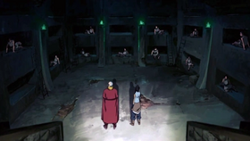 Back at the compound, the Dai Li sergeant attacks the airbenders with earth disks to test their abilities. Kai defends Yung, prompting the sergeant to attack him with a series of disks which inevitably subdue him. Kai then unsuccessfully tries to attack the sergeant and is sent to solitary confinement, where Jinora's projection suddenly appears in front of him. After assuring Kai that she will find a way to free him, Jinora floats to the surface and discovers that the compound is directly underneath the Earth Queen's temple.
