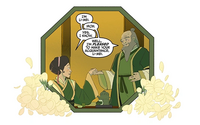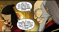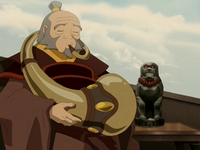 Iroh traveled to Yu Dao for the presentation of its new coalition government, where he ran into Team Avatar and the Air Acolytes. Following the banquet, in which he held the center seat, Iroh returned to Ba Sing Se to manage his tea shop.[75]