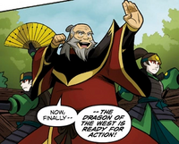 As the Crown Prince of the Fire Nation, Iroh was essentially "forced" by public expectations to join the military.[29] Like his father before him, Iroh became a renowned Fire Nation general during the Hundred Year War,[30] serving for decades.[3] He enjoyed serving as a military commander and fully embraced his role as heir to the Fire Lord, later musing that his blood "boiled with desire" for power at the time.[30] His views at the time partially stemmed from a desire to honor his father Azulon and grandfather Sozin, both of which had fully committed themselves to the war.[31] Whenever he returned to the homeland from the frontlines, Iroh spent time with his family, most importantly Lu Ten.[14] Over time, Iroh also grew close to his nephew Zuko, teaching him Pai Sho tricks, taking him to festivals,[32] and sneaking with him into the palace's kitchen to steal snacks.[33]