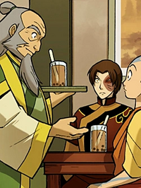 Just as he had hoped, Iroh spent his days after the end of the Hundred Year War running the Jasmine Dragon and perspicaciously playing Pai Sho. When Zuko felt conflicted he would talk to a picture of Iroh, expressing his desire that Iroh were with him, though he never followed through. Zuko knew that a quiet life was all Iroh ever wanted and therefore, knowing that there was no better way to repay his former mentor for all he had done, left Iroh in peace. For almost a year, Iroh was oblivious to the events that transpired at Yu Dao. Later, when Zuko fainted after the conflict of the Harmony Restoration Movement, Aang took him to the Jasmine Dragon, and Iroh cared for Zuko while he recovered. When Zuko finally awoke, Iroh alerted Aang, who was meditating on top of the building. Iroh thanked Aang for bringing Zuko to him, and pointed out that even though Zuko was Fire Lord now, he was still a stubborn boy and should not forget that he still had a place here. When Aang and Zuko talked, Iroh came by to serve them his newest beverage, which consisted of balls of tapioca that were cooked until soft, before being placed in tea. Iroh claimed that his invention was a revolution in tea. Despite this, Zuko and Aang both disliked the drink, causing Iroh to sadly remark that he was "a man ahead of [his] time".[73]