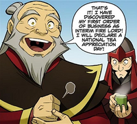 As soon as Team Avatar departed the next day, Iroh wondered why he ever dreamed about living in the "dreary" Fire Nation palace. When Suki asked whether or not there was something she could do for him to make him feel more at home, Iroh stated that the problem was that the Fire Nation had too many weapons and not enough tea. He subsequently performed his first action as interim Fire Lord by announcing a "National Tea Appreciation Day", and replaced the spear of a nearby guard with a cup of tea, encouraging him to drink it.[74] Even though Iroh appreciated being Fire Lord more than he thought he would, it also made him miss his tea shop in Ba Sing Se.[75]