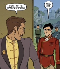 Six months after the end of the Anti-bending Revolution, Avatar Korra requested Iroh's help once again to aid the southerners against the Northern Water Tribe. Aware that helping Korra would mean going against President Raiko, Iroh informed her nonetheless that he was willing to help, musing that he could mask it as a routine training session; if he were to take his fleet south and happened to encounter hostile Northern troops, he would have to defend himself. However, in the middle of their meeting, President Raiko boarded the ship, commanding Iroh to remain at the harbor unless he received direct orders from the President stating otherwise. Raiko made it clear that if Iroh were to disobey those orders, he was to be court-martialed. Unable to help Korra out himself, he suggested that she travel to the Fire Nation to talk to his mother, the Fire Lord, as she and his grandfather had always been good friends with the Avatar and the Southern Water Tribe.[4]