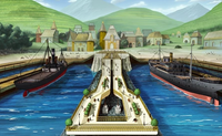 The port was the original settlement of the island. Originally starting as a small and crude pier, it grew constantly even through the Devastation. It remains one of the best ways to get to the island without Sky Bison. The entire city is built around this port, and as it advances further into trade for its economy, it becomes an increasingly important part of the island. By the port is a rock formation jutting out into the water, said to be where the deer fox spirits appeared to the islanders. While there is no official name for it, most islanders refer to it as Deer-Fox Rock.[39]