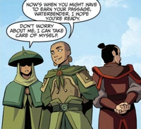 As Jiang made her way into the village, Katara's friends arrived on Appa. Before they could leave again, the pirates approached them. On their behalf, Jiang explained that they would like to make Katara an honorary crew member. The waterbender accepted but urged the pirates to consider becoming law-abiding after the conflict. Although the captain expressed sympathy for the request, commenting that she was getting "too old" for these kinds of adventures, she also told Katara that she could always become a pirate if she tired of aiding the Avatar. With that, they parted ways.[1]