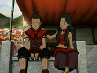 Haru and Katara were happily reunited prior to the Day of Black Sun invasion and fought together during the battle to take over the Fire Nation Capital.[9] The attack failed, and Haru briefly joined the others, venturing to the Western Air Temple.[10] When Azula attacked the temple, Haru accompanied Katara's father while the rest escaped the temple on Appa.[2] They reunited again during Zuko's coronation.[14] Haru was also briefly mentioned when Toph joked that he and Katara had previously had a secret thing together after the latter declared she had a surprise for everyone; Katara, however, denied that this was the case.[49]