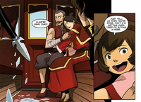 After the attackers were subdued, Kiyi and her family finally arrived at the Fire Nation Royal Palace, where she eagerly dragged her father along to explore the palace, despite Noren's concern that she should rest after an exciting afternoon. Kiyi brushed him off, saying that "Zuzu" would keep them safe, which surprised both Zuko and Ursa.[1] She quickly grew comfortable at the palace, often exploring it on her own. Once, she watched Zuko training firebending forms in the courtyard, and memorized them as she believed that they made him "so brave".[4]