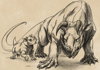 The creature's mouth and jaw structure look somewhat reptilian, but the small ears on either side of its head are mammalian. Its torso resembles that of a rhinoceros but ends in a long, lizard-like tail. The rhino's feet are short, muscular, and clawed.[1][16]
