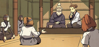 In 100 AG, Kyoshi Island was again visited by Sokka and Katara. The people of Suki's village were deeply disappointed upon learning that Aang was not with them, though Oyaji helped the two in finding evidence for the Avatar's trial at Chin Village.[1]