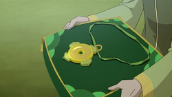 Earth King Wu presented Kuvira with the ornate piece of jewelry during his coronation in 174 AG for her efforts in unifying and stabilizing the Earth Kingdom, noting that it was one of the few valuables that had not been plundered during the anarchy in the Earth Kingdom. The metalbender initially accepted the award but after her subsequent speech in which she denounced Wu's power and declared an "Earth Empire" under her rule, she levitated and crushed the medal with her metalbending to emphasize that anyone who opposed her new nation would suffer the same fate, before dropping it contemptuously at her feet.[1]