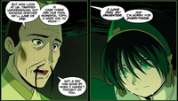 After Aang and Toph's students rescued the group, Lao quickly reacted as his daughter collapsed from exhaustion, catching her in his arms and assuring The Dark One that she would be fine. He told the students who he was before worriedly resuming his watch over Toph. Lao took her over to a table and held her hand as she lay unconscious when a female worker ran over and called to him. At first, he scolded her for yelling as Toph needed her rest, but to his distress, the worker informed him that Aang was about to destroy the Earthen Fire Refinery. When Toph awoke and asked what was happening, Lao began to explain, but quickly stopped and requested she continue to rest. Toph rebuffed him, not wanting to be safe, prompting Lao to apologize and reveal what Aang was about to do for reasons he was not sure of. The businessman added that it would not only ruin him but also remove a symbol of peace, a sign that nations could work together; he thus called on his daughter to help and watched as she and her students honored the request. His refinery, however, was ultimately destroyed by the angered spirit, General Old Iron.[1]