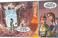 As tensions escalated from Liling's bender supremacists who revealed Lao's proposition to ban public bending, the Business Council building was set on fire with Lao and several other council members still inside. However, they were saved thanks to Team Avatar's quick intervention. Aang and Katara doused the fire with waterbending, Toph broke down the doors and guided her father and the others out. At that moment, one fellow council member told Lao that he had an extremely impressive daughter, causing him to proudly smile. Regardless, the attack on the council was merely a distraction, as the supremacists successfully freed Liling who had been imprisoned at the Earthen Fire Refinery. Once there, Lao supervised the damage and listened as Team Avatar planned their next moves.[8]