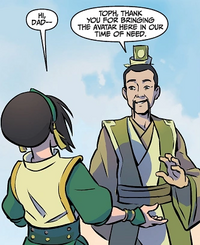 However, the two earthbenders were thwarted by Toph's new metalbending abilities, finding themselves locked in the very cage intended to hold her. After they escaped, they gave up their search for Toph, inciting a rift between Lao and his wife Poppy, who blamed her husband for losing their daughter.[1] Lao decided to leave Gaoling to make a new life for himself, and was approached by Loban with an offer to start the Earthen Fire Refinery together. Even though he still could not cope with the fact that his daughter was not like he had always believed,[4] Lao continued to love and worry for Toph during this time, blaming himself for everything that had happened.[1]