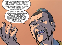 They arrived soon afterward, and Lao greeted his fellow Business Council members before beginning a small speech. After praising Cranefish Town's recent successes, Lao noted that bending violence had become a major issue, and proposed to ban public bending. The proposal stunned the Avatar and caused the council to descend into a heated dispute. One of the bender council members claimed that benders should be free to use their abilities however they want, with another accusing Lao of having an anti-bender agenda. In response, one of the nonbender council members asked the benders how they would solve the problem, stating that she is afraid to walk through her own neighborhood at night. The meeting broke down as the two sides hurled accusations at each other, while Lao attempted to calm them down.[5]