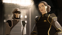 After Korra defeated Vaatu, Lin received word from Lord Zuko that Zaheer and the Red Lotus had escaped, and ventured to Ba Sing Se to warn the group and take Korra back to Republic City. However, upon Korra's desire to rescue Ba Sing Se's airbenders instead, Lin decided to join the mission.[18] Although she kept her distance on the outside, Lin cared deeply for Korra, constantly worrying for her well-being, though she also trusted the Avatar's judgment. When Korra was wheelchair bound during her recovery from her battle with Zaheer, Lin was sympathetic toward her, openly showing her affection by placing a comforting hand on her shoulder and telling her to hang in there, before readily helping her to ascend the stairs to the temple on Air Temple Island.[14]
