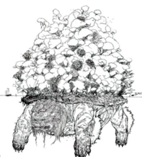 Young lion turtles are significantly smaller in size than the adults but are still considerably large, growing to the size of an adult flying bison. Lion turtles can survive for centuries if unharmed and reach the size of a small island, developing hard shells that eventually grow plant life that can sustain several species of animals.[9] This effectively creates small ecosystems on the backs of lion turtles, which neither benefit nor harm the hosts in question.[10] Lion turtles are so enormous that their hearts can weigh over 120 tons, which is comparable to the combined weight of twelve flying bison.[11]