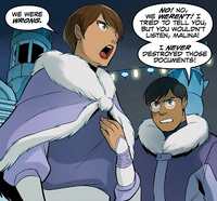 After his actions were revealed, Malina attempted to assuage the Southerners' anger, promising that she would take her brother and leave the South. Gilak, however, used Maliq's confession as justification to sic his soldiers on the two of them, intending to capture and execute the siblings for their deception. Though Maliq and Malina were able to flee the city, they were intercepted and captured by Gilak's forces, and were only spared due to the timely intervention of Hakoda and Team Avatar.[1] Following Gilak's arrest, Maliq was forced to leave along with the other Northern workers. However, Malina distanced herself from him and remained behind.[3] Even though their relationship was strained following their disagreement about the project, he continued to work on a plan to convince his sister that he was right about the Southern Water Tribe's weaknesses as he moved between the North and the South, as he believed his point to be for the greater good for both tribes.[4]