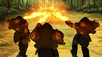 Kuvira led another battalion of mecha suits to the Foggy Swamp, where she ordered them to start harvesting all the spirit vines they could find at the base of the banyan-grove tree.[8] They ran into some trouble, however, when the vines started to fight back, though by using their chainsaws and metal cables, the mecha suits were able to overpower the hostile vegetation.[9]
