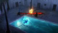 Later that night, Ghazan and Ming-Hua arrived at the Misty Palms Inn in search of the Avatar. Alarmed by their presence, Mako urged Asami to take Korra's body to safety on Naga, while he and Bolin occupied the two benders. Ming-Hua attempted to ensnare the polar bear dog, but was quickly overwhelmed by a series of attacks from Mako, whom she eventually managed to subdue using a water tendril. Meanwhile, Bolin attempted to defend himself from Ghazan's lavabending to no avail, eventually choosing to dive into a pool in order to shield himself from the flaming earth projectiles. Ming-Hua proceeded to trap the earthbender inside a water orb, before lifting him out and holding him alongside Mako, who remained unconscious and immobilized on her other water tendril.[1]