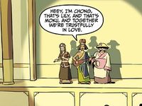Later, Moku, Chong, and Lily formed a band called Trustfully in Love, which became extremely popular. The band toured in large cities such as Yu Dao, where they performed in a concert hall in front of many fans, including Suki, who had encouraged Sokka and Toph to come join. The band played for more than three hours that night, and Chong was followed by a mob of fans the following night. After their stay in Yu Dao, Chong decided that they would no longer perform as Trustfully in Love and would go back to performing out of love of music rather than money. Despite their decision, they decided to use their earnings to create a comfortable lifestyle for themselves and purchased a luxury wagon to travel around with. The performers waved off Suki, Sokka, and Toph, as they prepared to play music across the world.[3]
