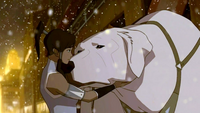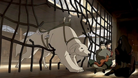 While Korra was being held captive by Tarrlok, Naga tracked her to the area where she was and found her in the snow after her escape. The animal proceeded to carry an exhausted Korra back to Republic City on her back, where the rest of Team Avatar found them, guiding themselves on her howling.[2]