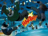 Noa attacked the child near Sokka with his waterbending, causing Katara to pelt him and his colleagues with snowballs in retaliation. Noa and Kam combined their bending to merge Katara's snowballs into one large ball and launch it back at her, declaring that she was apparently the one in need of a lesson. Katara, however, easily stopped the ball from crushing her, gave it dangerous spikes and intended on throwing it at the three construction workers. Frightened by the sight, Noa surrendered and reasoned with Katara that they only intended on scaring the children, not hurt them. They trio quickly retreated back inside the half-finished building afterward, leaving Katara and Sokka to lead the children out of there.[1]
