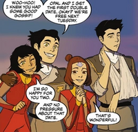 Later, Opal attended Varrick and Zhu Li's wedding at Air Temple Island; she sat between Korra and Tonraq during the wedding ceremony. When the dance floor was later opened during the dinner party, Opal dragged Bolin onto it.[15]