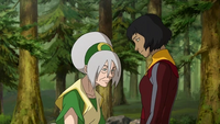 Sometime later, Opal discovered her mother and Lin locked in a duel, both charging each other with large pieces of earth held above their heads. Horrified that the sisters would want to hurt each other, she intervened by blasting the rocks away and reprimanding both women for their actions. Before she could get a reaction, however, she watched Lin collapse. Sixteen hours later, Opal found her aunt in the dining hall. She moved to leave, though was called back and invited to sit down, so they could talk. Lin apologized to her niece for snapping at her the other day, explaining that she and Suyin had a complicated relationship. Opal concluded that being in Zaofu made Lin uncomfortable, which prompted Lin to compliment her intelligence. When her aunt suggested that she go to the Northern Air Temple to train, Opal confided in Lin that she wanted to go, but at the same time, she did not want to disappoint her mother by leaving her home. However, she was subsequently told that she needed to make decisions based on what she wanted, not to make someone else happy. Thankful for the advice and the talk, Opal hugged Lin, before leaving the dining hall to find her parents and tell them about her desire to go train with Tenzin.[5]