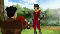 After dinner, Opal was practicing some airbending katas when she was approached by Bolin. As he talked to her in a flirtatious manner, she asked him why he was acting strangely. Receiving the same question as a response, Opal said she did not like how he was talking to her and began to walk away. Her retreat was quickly halted when Bolin jumped in front of her apologized, saying he got self-conscious when he knew a girl liked him and ended up acting stupid. Opal wondered where he got the idea that she liked him, but soon revealed that she was joking. She told Bolin to stop trying so much and just be himself. The two gazed each other deeply in the eyes, though Opal quickly put some distance between her and Bolin when Korra cleared her throat to reveal her presence. When asked for assistance, Opal left with the Avatar.