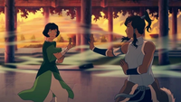 Despite being a new airbender, Opal demonstrated considerable skill in the bending art, able to seamlessly create swirls of air in tandem with Korra, who referred to her as a natural. While practicing after dinner, Opal was able to perform multiple blasts of air and create a powerful airwave by striking the ground.[2] She was even strong enough to break up a duel between her mother and her aunt Lin, two powerful earth- and metalbending masters, in a single move.[5] Over the course of three years, Opal improved her airbending skills, as evidenced during her time with Kai in their patrol around the Earth Kingdom[3] and during her battle with Kuvira's army, where she and Jinora protected Korra by creating a strong whirlwind, which she was able to maintain by herself.[1]