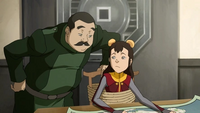The three of them settled down to have a conversation with each other and when the soldiers lamented over being left behind by Kuvira, Ikki sympathized with them as she felt like her siblings constantly excluded her from any fun stuff. Pointing out that Jinora and Meelo would not let her help in their search for Korra, the soldiers offered to help her instead. Giving her a map, Ikki indicated the route she had been traveling. When one of the soldiers noted that none of their troops had reported a sighting of the Avatar, Ikki asked about the Foggy Swamp, as no military seemed to be based there. Just as the soldiers were about to release her, emphasizing that she had a big heart and was a valuable member of her team, Meelo and Jinora barged in and knocked the soldiers out with their airbending. Before leaving the soldiers' house, Ikki apologized to them on her siblings' behalf and left them each with one of Pema's self-made sweet buns with happy faces.[2]