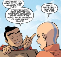 At this point, Aang admitted defeat. Sokka consequently tried to discuss the war with the soldier, noting that the Fire Nation's war could not be an effort to help others, as said others resisted the Fire Nation military. In addition, the Water Tribe boy pointed out that the Fire Lord's forces were generally the attackers, whereby the the other nations seemed to desire peace. Although the soldier admitted that all this was true, he denied the logical conclusion that the Fire Nation waged an aggressive, expansionist war after shortly thinking about it. Afterward, he began to loudly sing the Fire Nation's hymn, causing Team Avatar to regard any further talking pointless.[1]