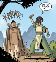 His aggressive and proud posture was easily shattered, as Toph casually used her earthbending to knock him sideways, causing him to fall flat on his face. As Team Avatar moved to return to the woods, seeing the soldier as no serious threat, he used his firebending to set the trees alight. Having regained his composure, the trooper loudly announced that he would not allow the Avatar escape and would follow him to "the ends of the Earth". When his three opponents voiced their concern that the wildfire and his shouting would draw other Fire Army troops to their position, the soldier just pointed to himself and voiced his belief that he would not need any help from others to capture them - he would arrest the Avatar alone and get all the glory. To his surprise, he was then easily encased in rocks that were bent upward by an annoyed Toph.[1]