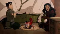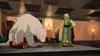 When the party arrived at Ba Sing Se, Grand Secretariat Gun immediately noticed Pabu, Naga, and Oogi, and instructed Team Avatar to hide the animals due to Earth Queen Hou-Ting's hatred of them. Bolin immediately resolved to tuck Pabu within his shirt, but remarked the other two animals as "tougher [to hide]". Pabu was left behind when Bolin and Mako set out to locate and retrieve Kai, their first recruit.[17]