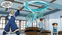 During the liberation of Ba Sing Se, Pakku fought many comet enhanced Fire Nation soldiers alongside Piandao by creating a large wave and quickly freezing it, allowing the swordmaster to slide down on it and disable the soldiers.[5] Together with the rest of the Order of the White Lotus, he was successful in freeing Ba Sing Se from Fire Nation control.[11]