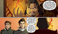 "Here, we honor tradition and protect our own. We take pride in delivering justice. And as soon as a boy starts firebending, we train him up and, when he's old enough, we deputize him. Our firebenders are the law [...] I take my job very seriously and if one of my citizens has a problem, I'll deal with it."