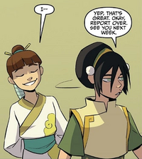 The success of Earthen Fire Industries meant that the academy gained a new sponsor. New facilities were built, and the academy began offering tuition for free. Toph also deemed Penga, Ho Tun, and The Dark One skilled enough to lead the beginner classes. Penga proved to be a very enthusiastic teacher at the academy. When Toph asked her students for a weekly report, Penga was excited to tell her about the forms she was practicing with the beginner metalbenders, but Toph cut her off and ended the meeting. Toph explained that the problem was that everything was so respectable and perfect, before leaving.