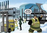 Just as they wanted to get back to their other tasks, the pile became unstable, causing Penga to scream that they should run. However, before they were able to move, an avalanche threatened to bury all three; luckily, Toph intervened and bent metal bars to contain the pile's collapse. Dazed by the near-death exerience, Penga weakly told Toph that they were fine as she rushed over to check on them. The three students quickly began to argue that they were unfit for this work, despite their sifu's declaration that they—as metalbenders—specialized in "the impossible". Regardless, Penga countered that trying to build factories at the South Pole without the help of waterbenders was "kinda crazy" to which Toph agreed, but noted how politics prevented them from getting any waterbenders as support.