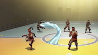 Singling Korra out as the weak link of the Fire Ferrets, they focused their attacks in the second round on her, swiftly throwing her into the water, though they were unable to solidify their victory as Bolin and Mako managed to stay in the game.